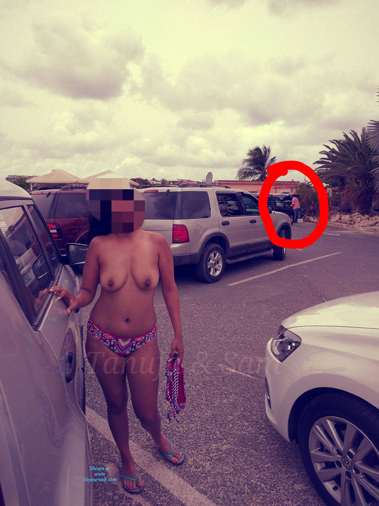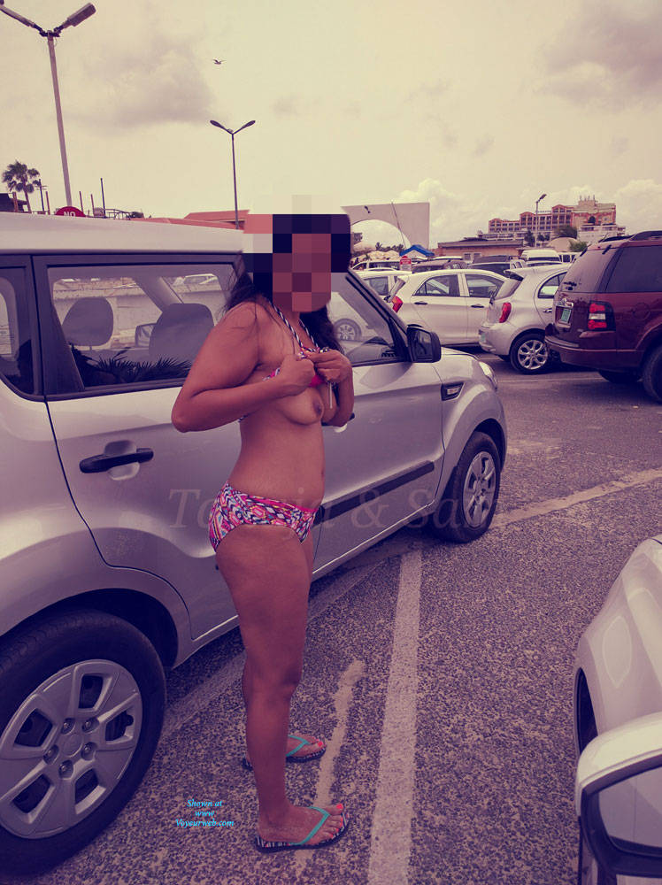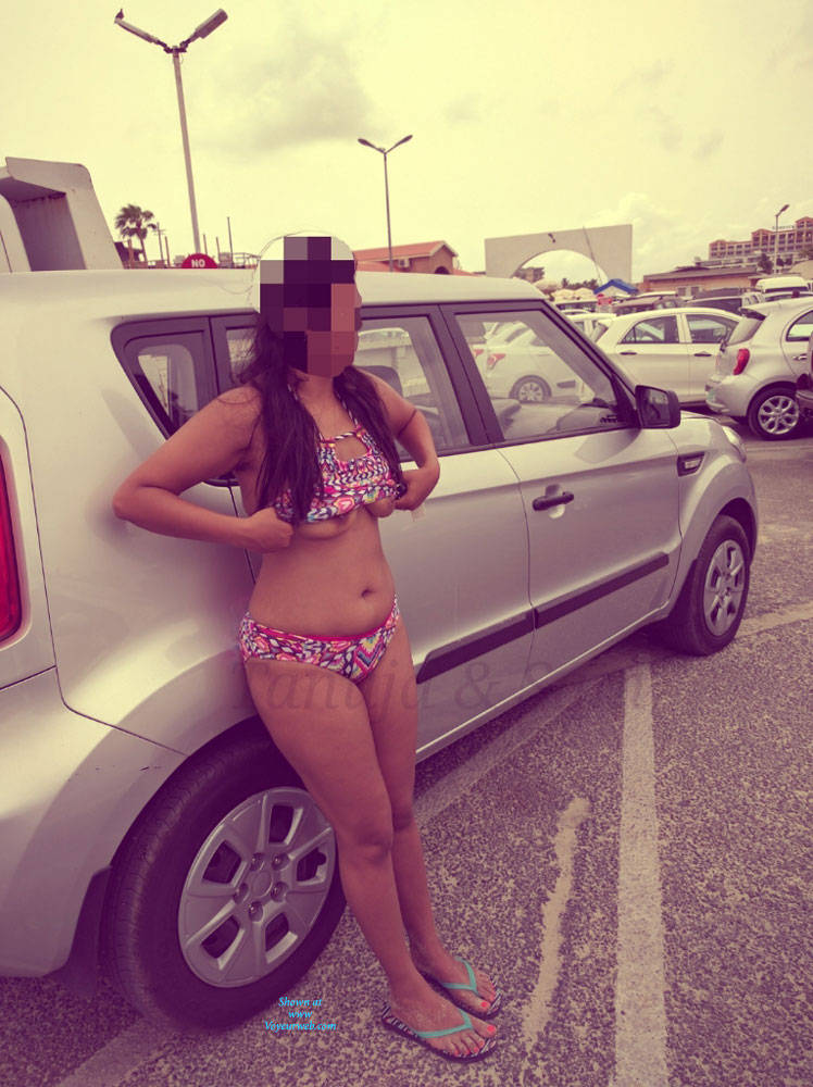 My wife, Tanuja, removed her bikini top to flash her boobs in the parking lot. A couple of guys saw her.
