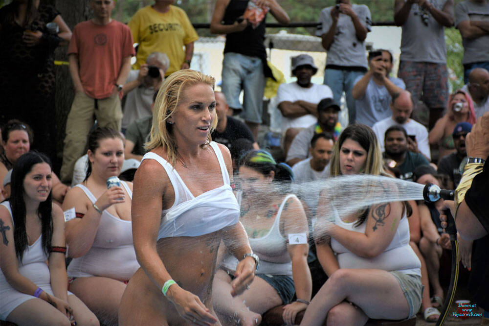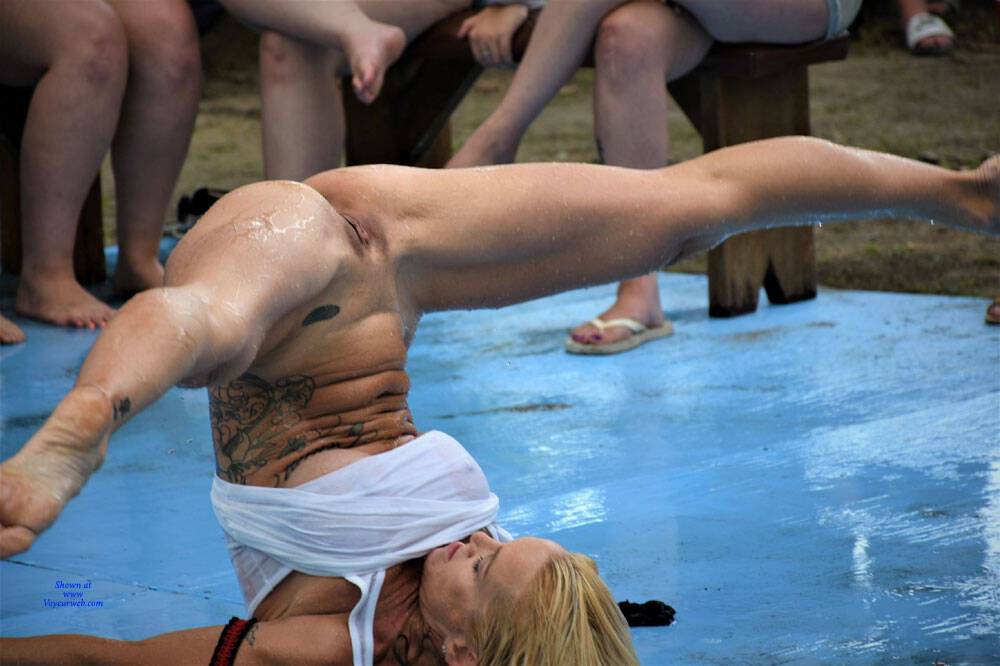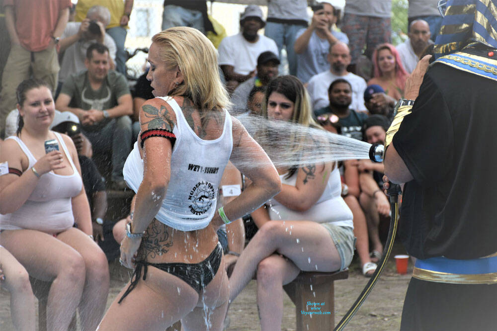 This babe was behind the main stage in the general admission grounds for two days watching the NAP 2017 contestants, always topless but wearing her bikini bottoms. When the Wet-T-Shirt contest took place at 4:00 PM on Sunday she competed, ripping off her bikini bottoms like they were infested with fire ants. She put on a great show and when she finished, she grabbed the mic from the Egyptian Pharaoh MC and announced that she was a of four from the Chicago area and that the NAP Wet-T-Shirt contest was on her bucket list. Surprisingly she didn’t win, but say mission accomplished!