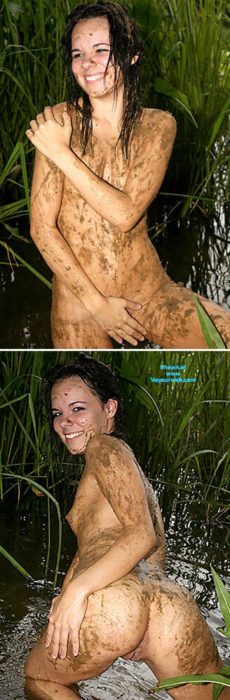 She was swimming in the lake and took a break in the shallow water and started thinking about her childhood playtime of making mud pies.